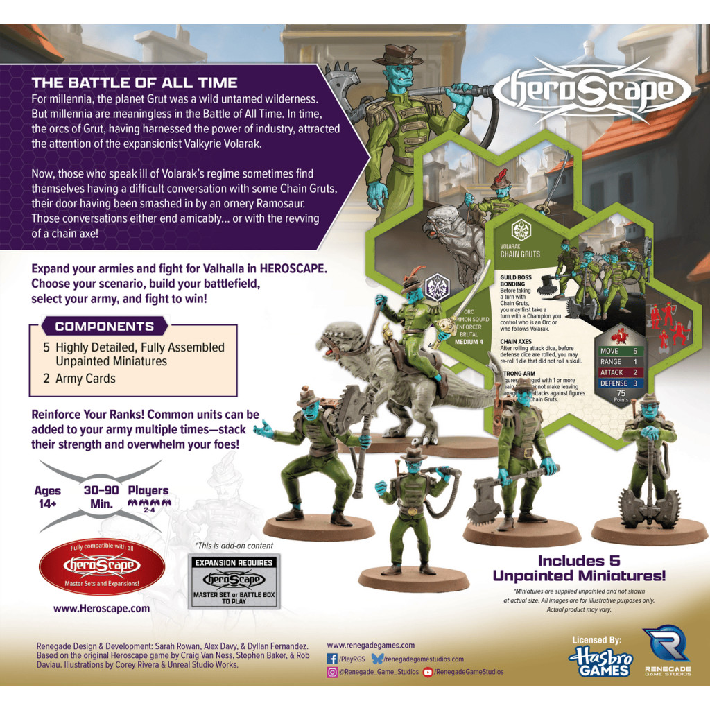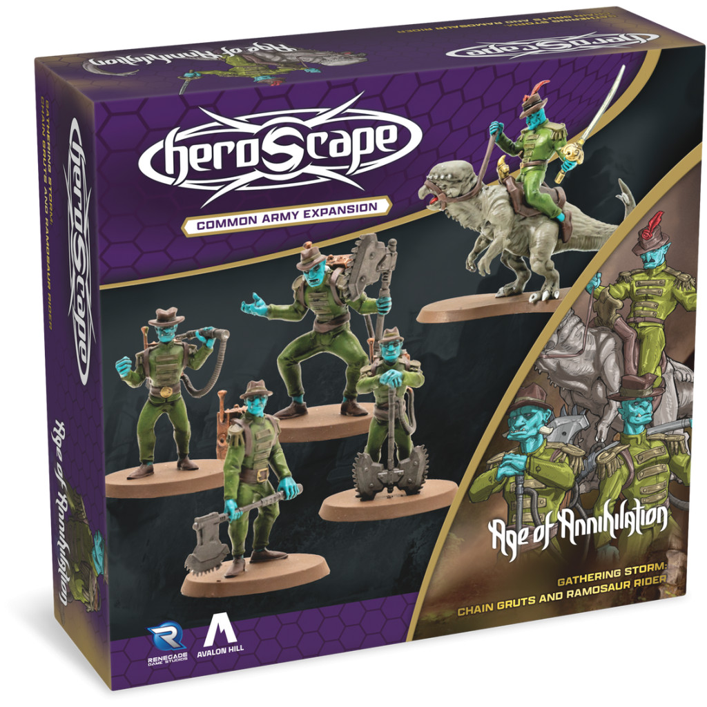 This expansion includes one 4-figure Common Squad and a Common Hero. The highly detailed, pre-assembled miniatures and 2 Army Cards are fully compatible with all Heroscape Battle Boxes, Master Sets, and Expansions. Get ready to charge onto the battlefield with the Ramosaur Rider, smashing enemy lines with devastating speed, and the Chain Gruts fighting in perfect coordination with their champions.