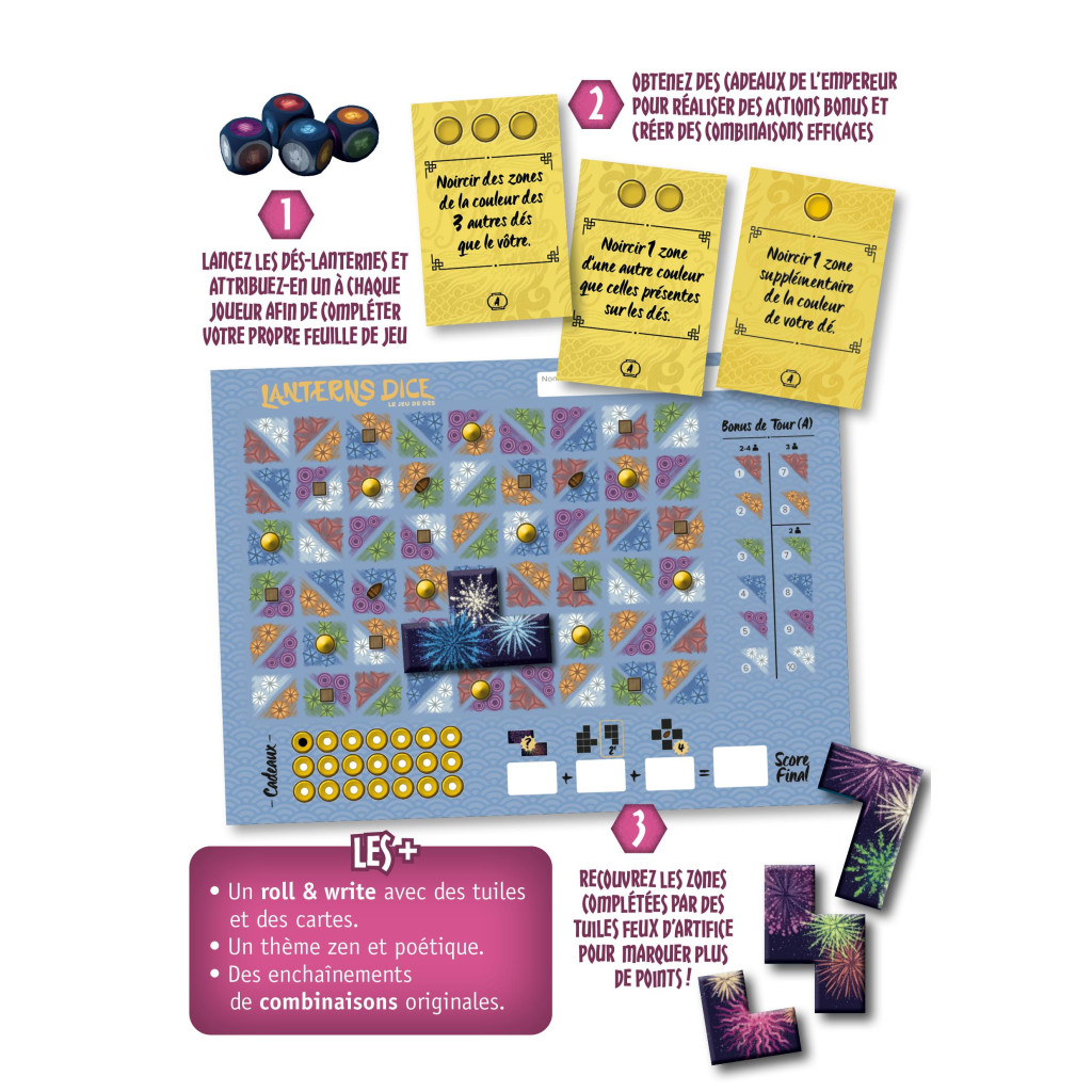 Une course au lancement de Feux d’artifice, au plus vite vous lancez un des 4 types de feux et plus vous aurez de chance de marquer le maximum de points d’Honneur, chaque pile de tuiles Feu d’artifice est classée par ordre de points décroissant. Bien sûr, plus le feu d’artifice sera grand plus leur valeur d’Honneur sera élevée.