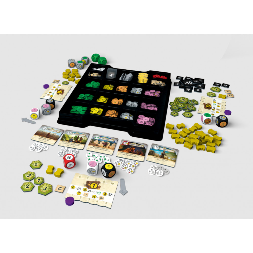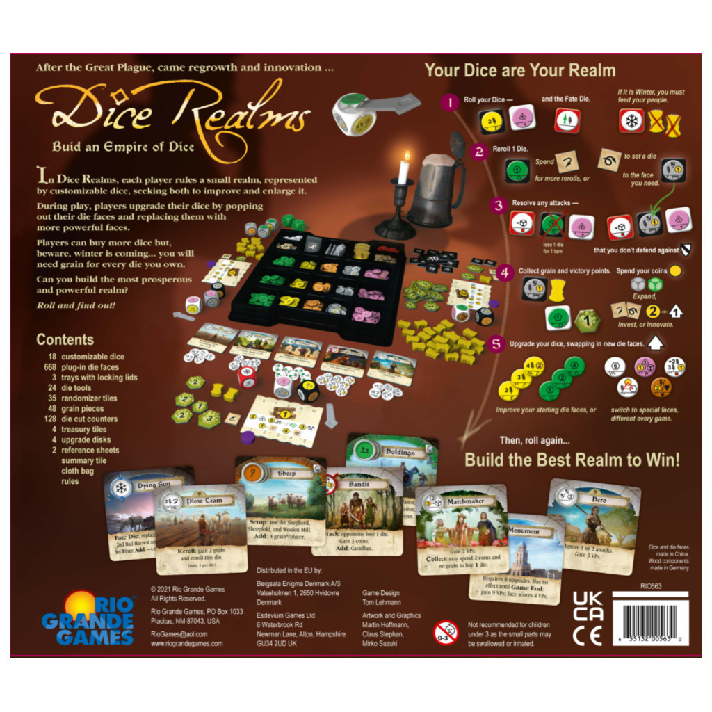 In Dice Realms, each player rules a small realm, represented by two customizable dice. The removable die faces allow for the strategic improvement of farming, mining, defense, upgrades, and more. Each round, the players simultaneously roll their dice to collect grain, victory points, and coins. Then, they must decide how to upgrade their die faces to improve their realms. But the players must be careful; each round, the Fate Die is rolled, and fate can be fickle.