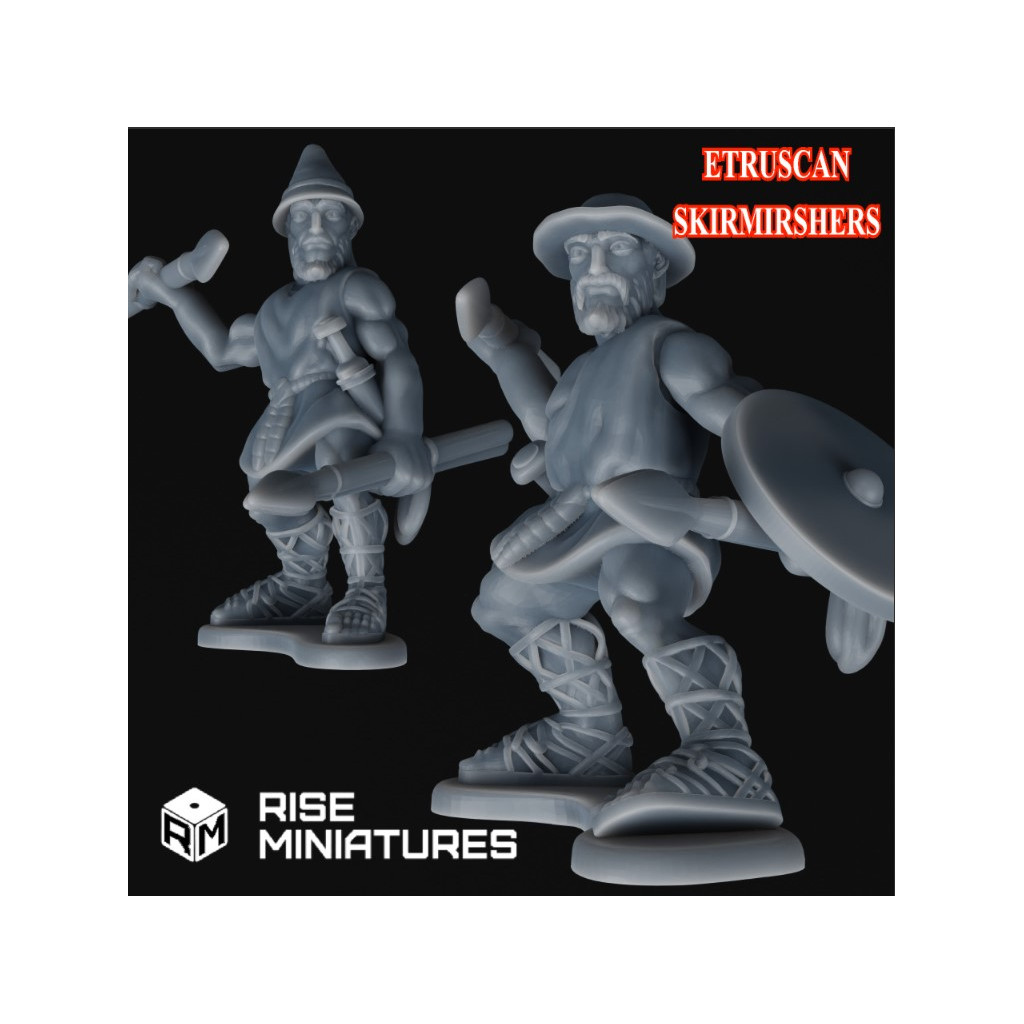 A set of 8 Etruscan Light Infantry with Javelots 3D-printed in 15 mm scale.