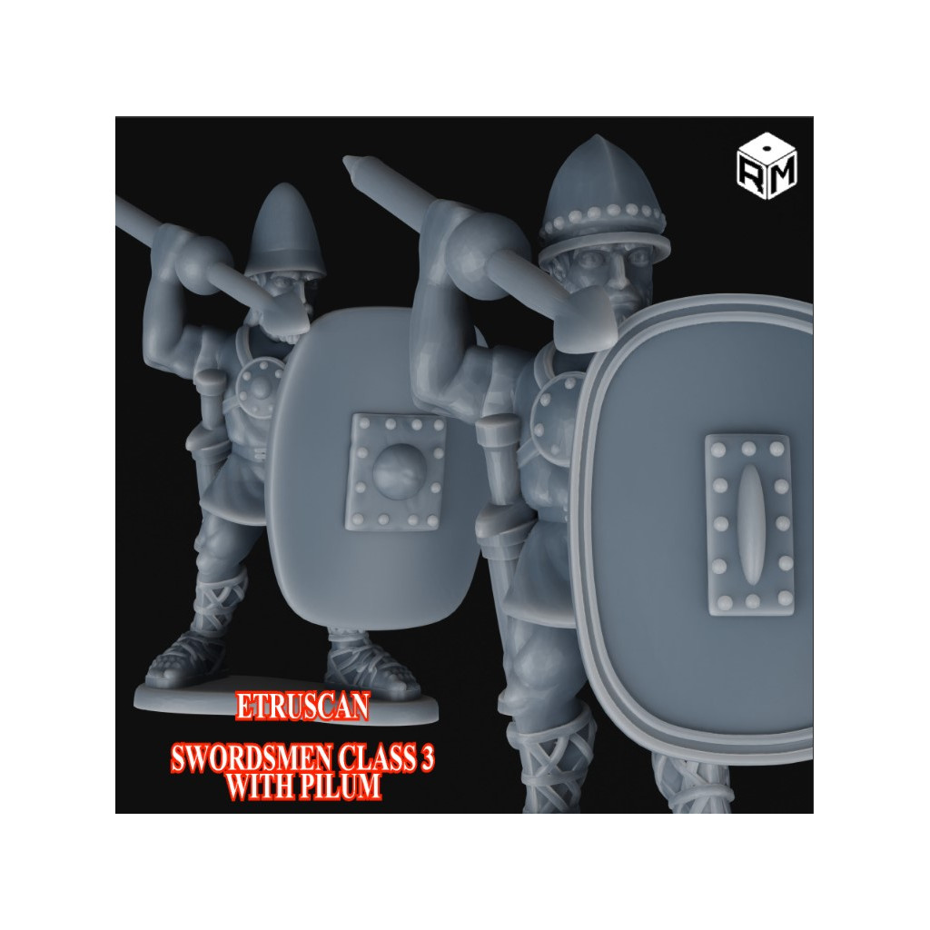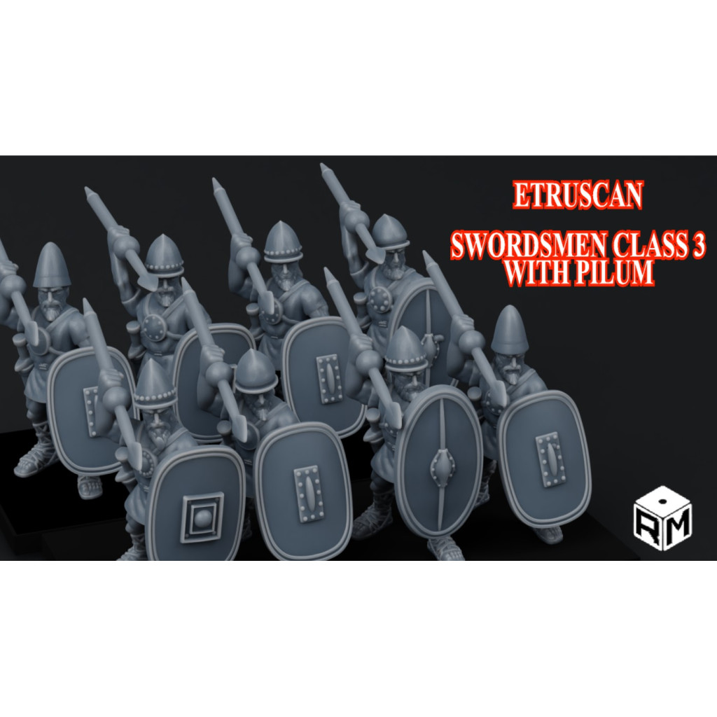 A set of 8 Etruscan Class 3 Swordsmen 3D-printed in 15 mm scale, equipped with pila