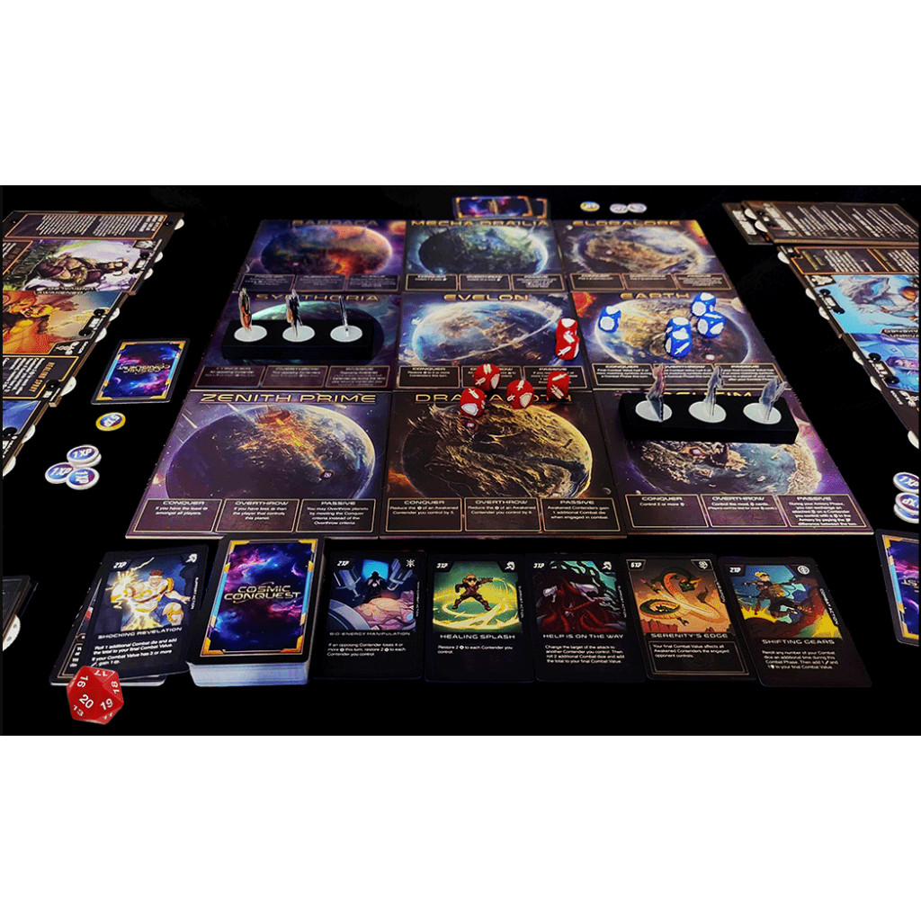 The modular game board encourages exploration, as players move across planets, engage in combat, and vie for planetary control. With each encounter, players accumulate Gambit Points, the key to victory. From rolling dice to playing Armory cards and leveraging Contender abilities, every decision brings players closer to ultimate conquest.