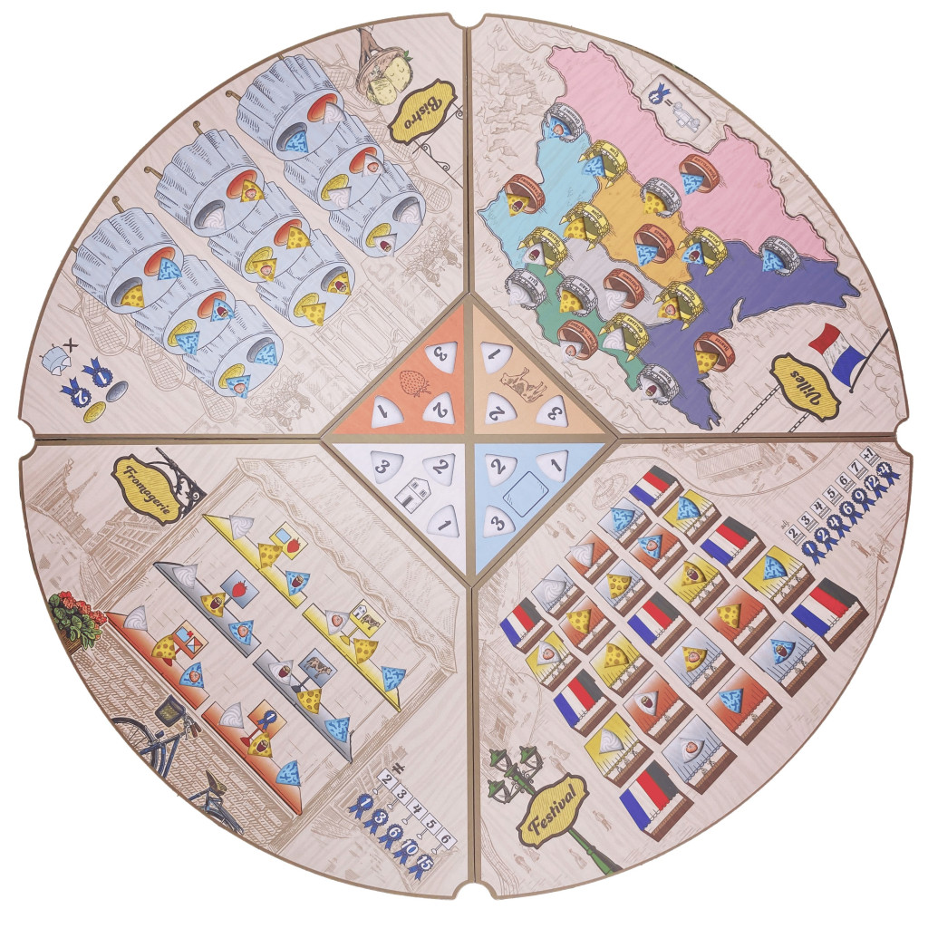 Fromage is a simultaneous worker-placement game where players place Workers to make cheese and gather resources from the quadrant of the board facing them. Once all players have placed their Workers, the board rotates, aging any cheese that was made, and presenting each player with a new quadrant to place Workers into. Score Prestige Points by selling cheese to the four locations, and by efficiently managing and upgrading your creamery.