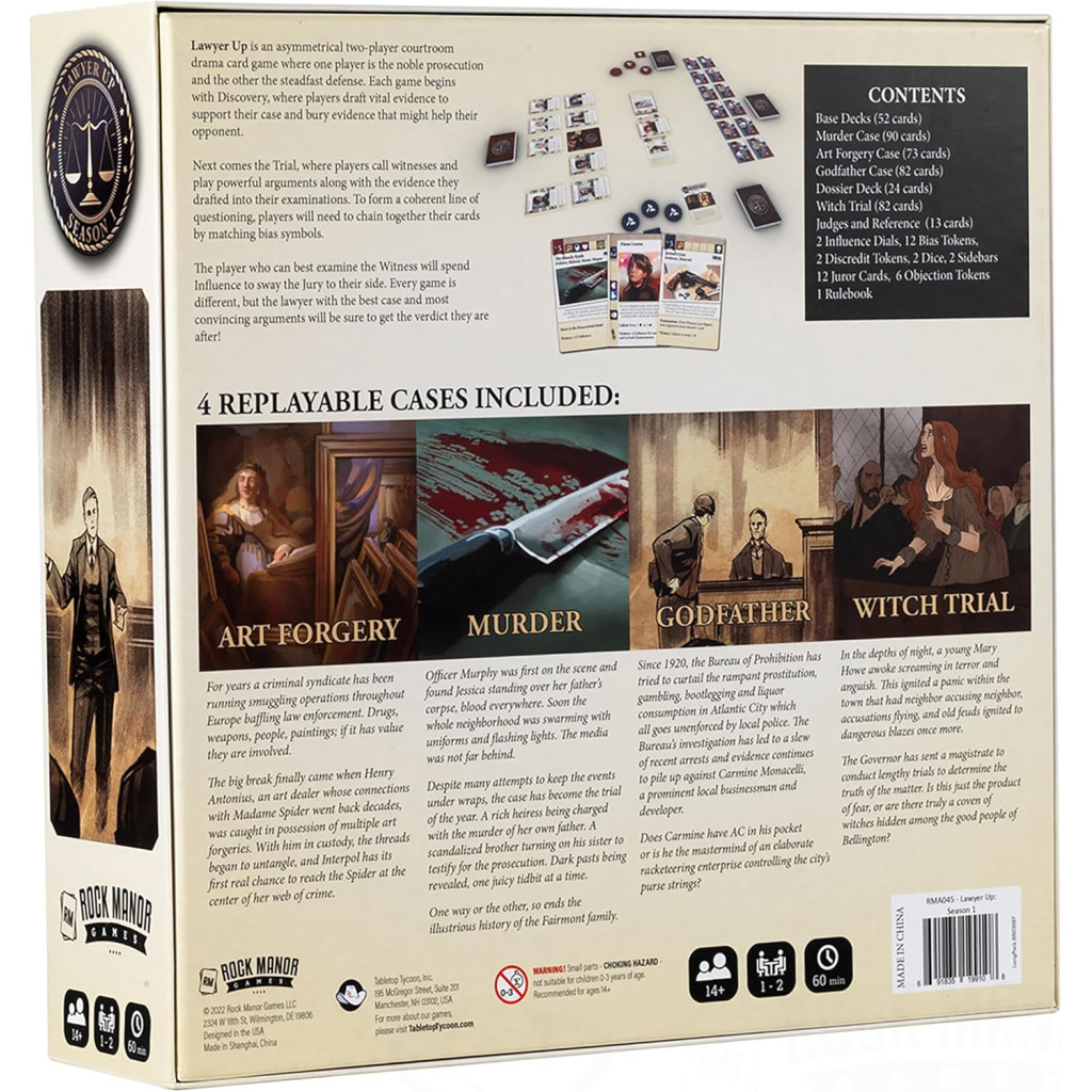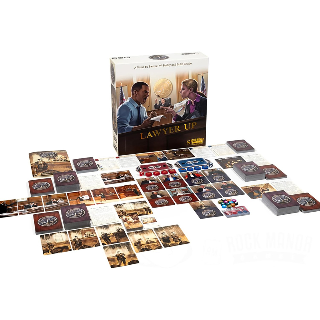 Lawyer Up is an asymmetrical two-player courtroom drama card game where one player is the noble prosecution and the other the steadfast defense. Each game begins with Discovery, where players draft vital evidence to support their case and bury evidence that might help their opponent. Next comes the Trial, where players call witnesses and play powerful arguments along with the evidence they drafted into their examinations.