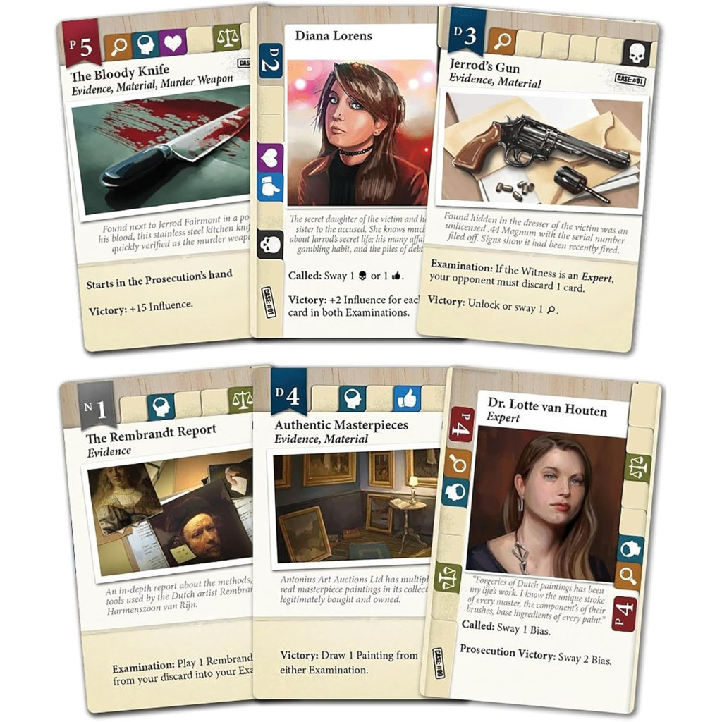 To form a coherent line of questioning, players will need to chain together their cards by matching bias symbols. The player who can best examine the Witness will spend Influence to sway the Jury to their side. Every game is different, but the lawyer with the best case and most convincing arguments will be sure to get the verdict they are after!