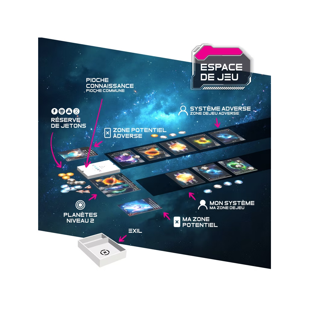 Your goal: build the ultimate cosmic system by combining creation, defense, destruction, and fusion… all while feeding your opponent’s “Potential” zone. Every action you take becomes an opportunity for them. It’s up to you to turn that risk into strength!