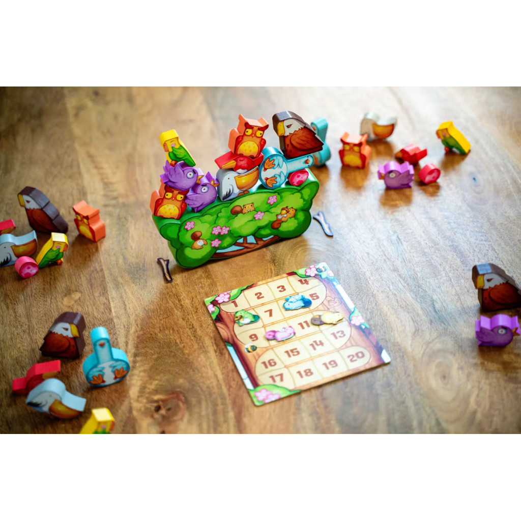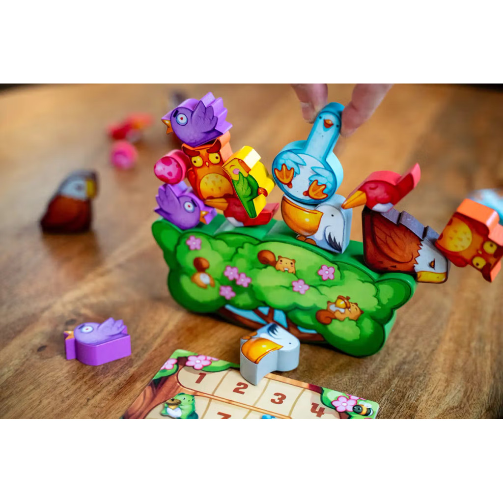 Take turns selecting from your pools of oddly shaped birds, carefully balancing them on the rocking nesting tree. If the birds hold firm you’re in the clear. The higher your climb, the more you score!
