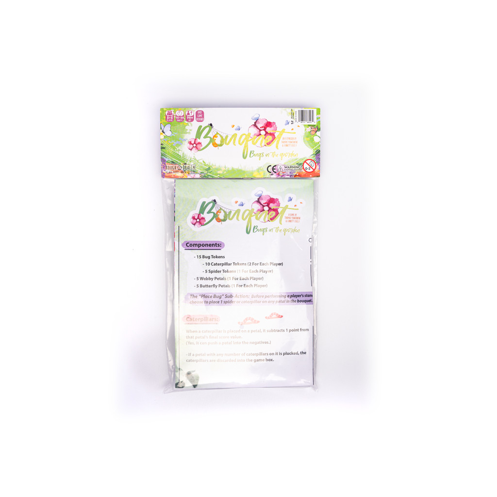 - Bouquet: Bugs in the Garden introduces several new insect-themed petals and meeples to your favorite flower bouquet! Spiders swap petal positions, and butterflies can barricade your opponent's process when used precisely! If you want to add an extra layer of play to your games of Bouquet, you want to snag this expansion!