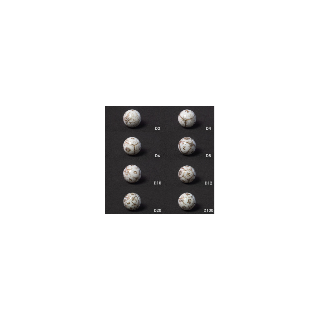 The set contains 8 dice with a diameter of 25 mm: D2, D4, D6, D8, D10, D12, D20, D100.