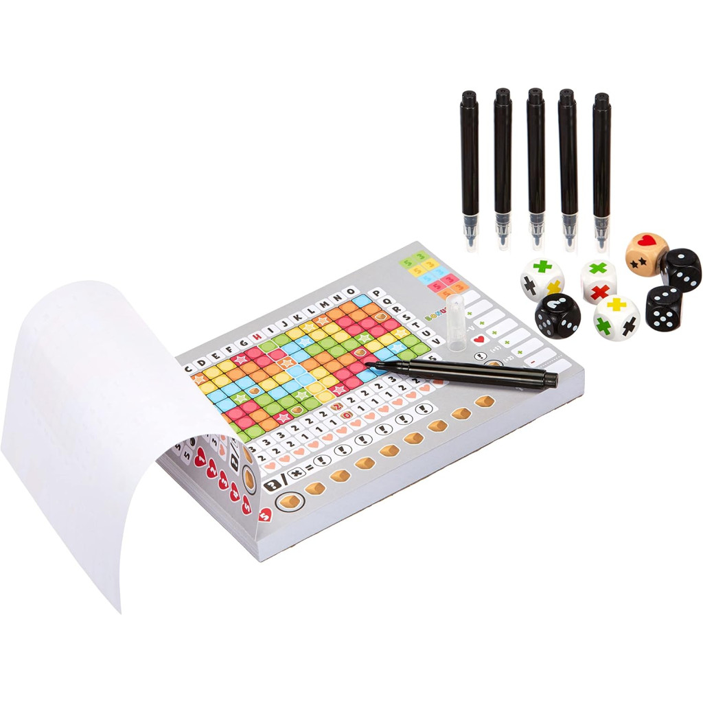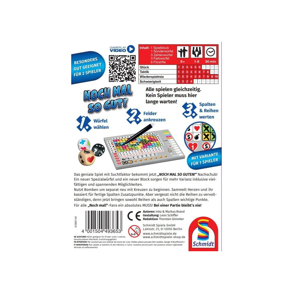Noch mal so gut! is a roll and write dice game in the Noch mal! family, adding further rules and possibilities of the popular predecessor. New elements include a seventh dice that can be chosen instead of the other ones (and a row and extra scoring for these dice) with new elements included on this dice - like a bomb (cross 4 fields anywhere), a heart (if crossed, it brings bonuses for completed columns), two stars (cross two stars anywhere) etc. Another new element is the rows also being scored besides columns.