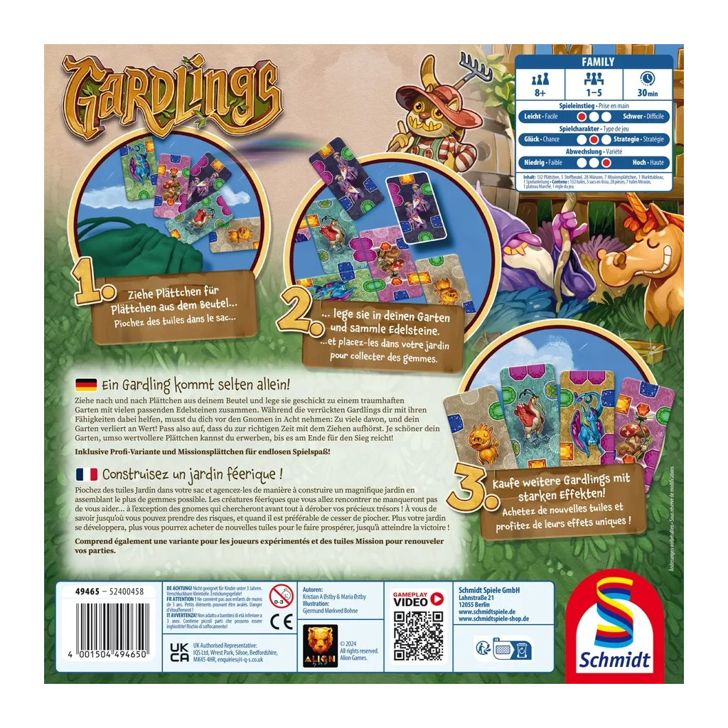 Each turn in Gardlings, all players simultaneously build their gardens in front of them. You can stop drawing tiles at any time, because if you draw too many gnomes, they will steal your gems.