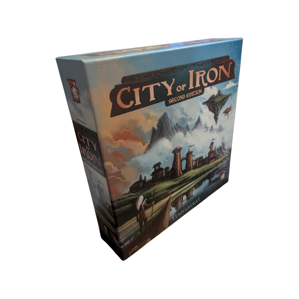 In City of Iron, 2 to 4 players compete as leaders of small nations in a world full of machines, magic, and money. Players aim to grow their economy by producing rare goods (like machine parts and bottled demons), researching steam‑age technology, recruiting mercenaries, and building cities. To reach distant territories — floating islands or remote archipelagos — players can also build schooners or airships.