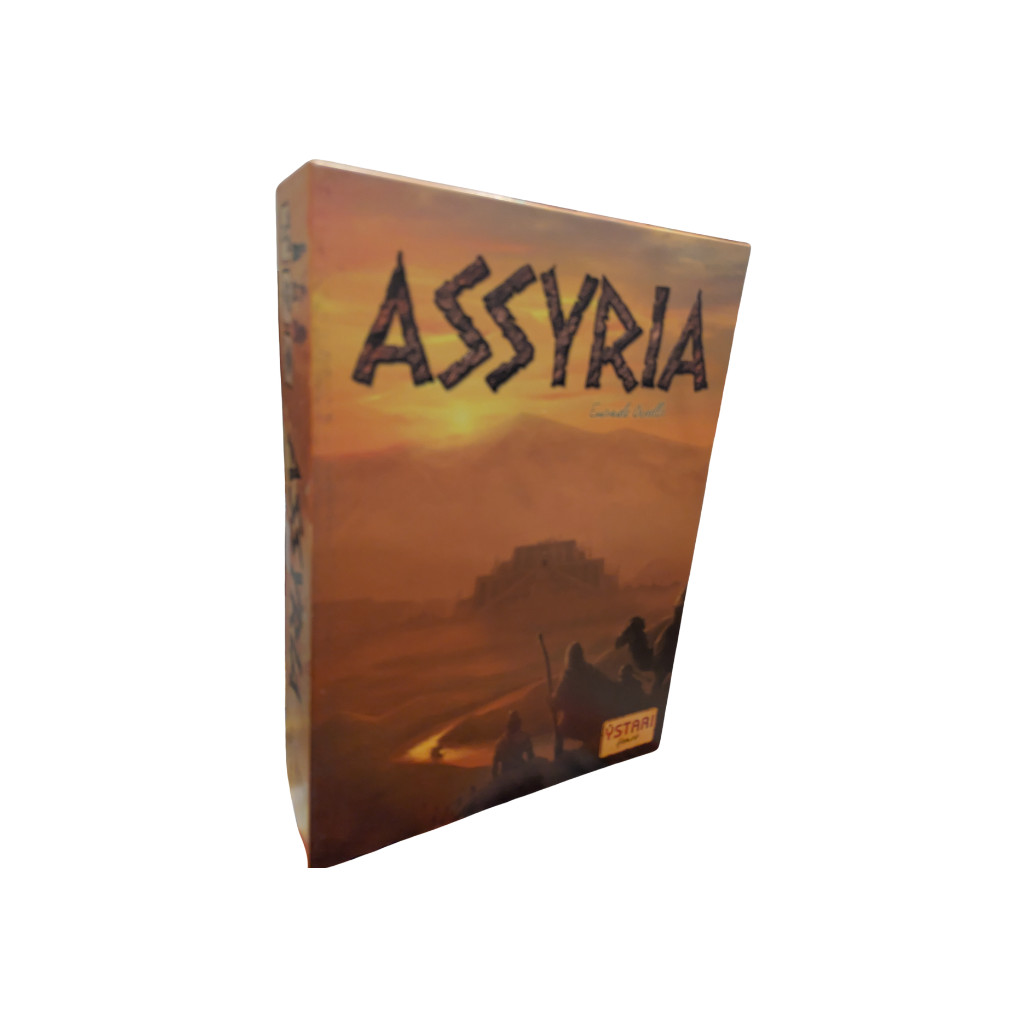 Assyria, players lead nomadic tribes in ancient Mesopotamia, struggling to prosper between desert lands and fertile zones by rivers. Players need to feed their huts, expand territory, build wells and ziggurats, make offerings to gods, and compete for fertile land control. The game is played over successive “reigns” — at the end of each reign a flood reshuffles part of the map, forcing players to balance short-term gains and long-term investments.