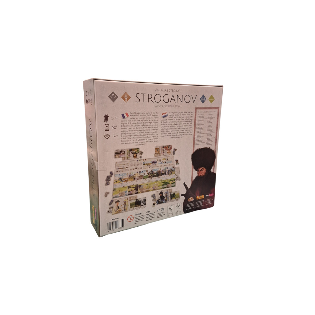 Stroganov - second hand is a strategy and exploration board game designed by Andreas Steding and published by Game Brewer. Players take on the roles of members of the powerful Stroganov family, tasked by the Tsar to explore the frozen expanses of Siberia, trade, hunt animals, and establish outposts to collect the most valuable furs and earn victory points.