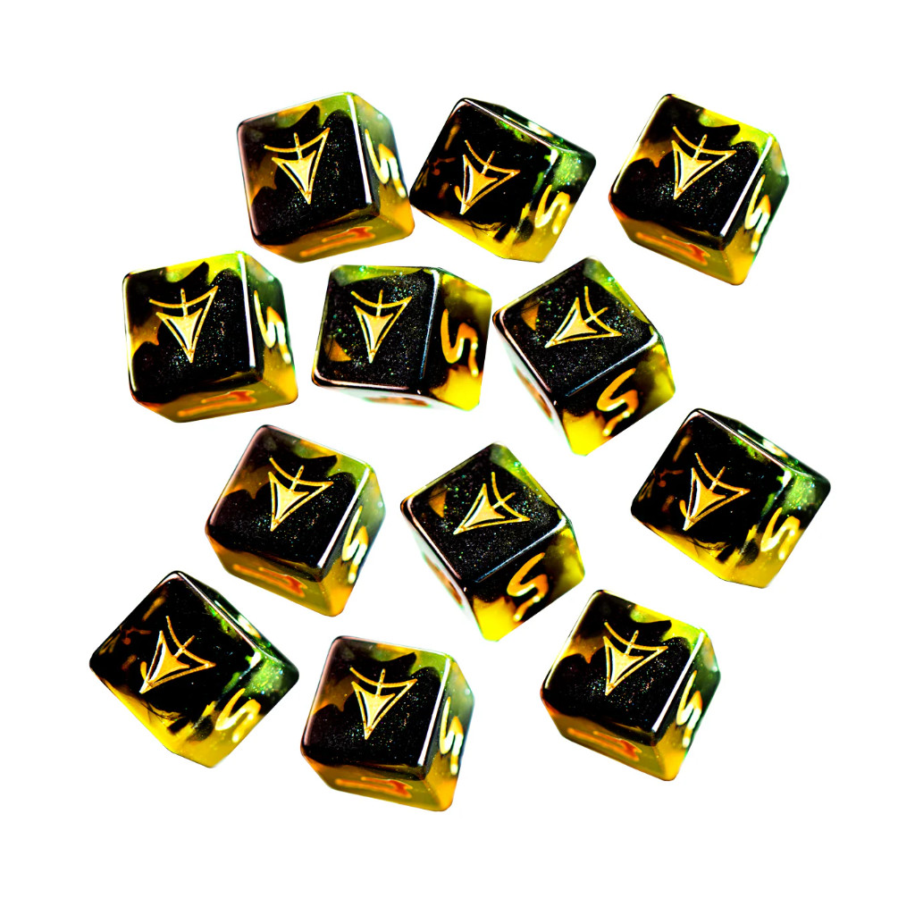 The Yellow Sign often appears to those who have dreamt of Carcosa. These twelve d6s reflect that influence with swirling layers of black, Hali green, and spectral gold. Iridescent glitter stirs like dust drifting through a ruined theatre. The six face carries the Yellow Sign in metallic gold.