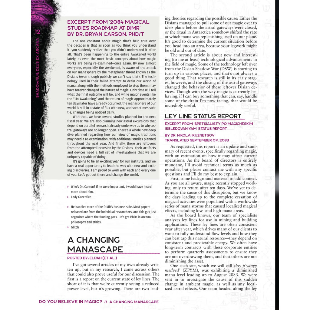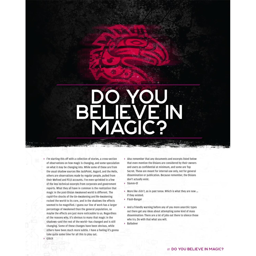 Deus Ex Arcana is the core advanced magical rulebook for Shadowrun, Sixth World.