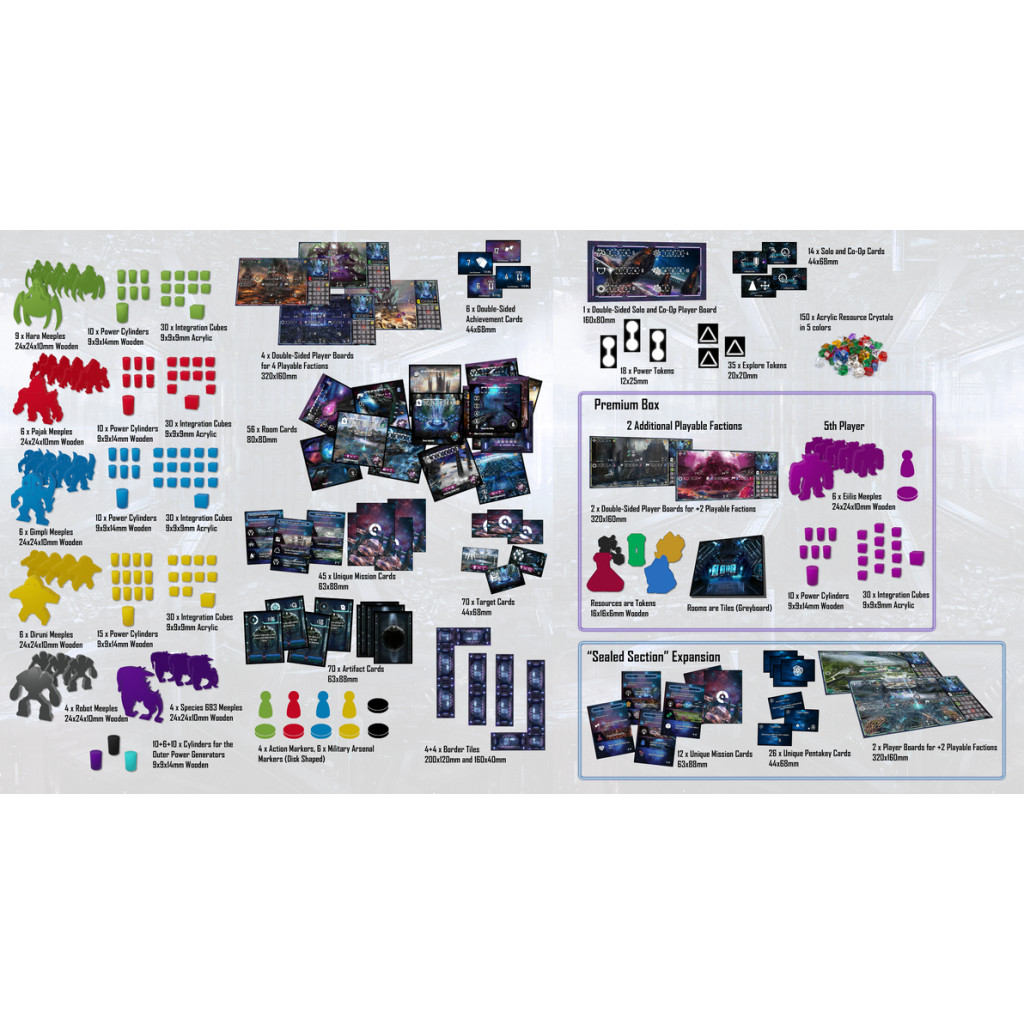 The Premium Box has upgraded components, +2 playable factions and components for a 5th player.