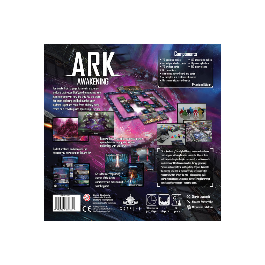 “Ark: Awakening” is a space-themed game with area control and engine building mechanics. It features a unique mechanic called "boost placement".