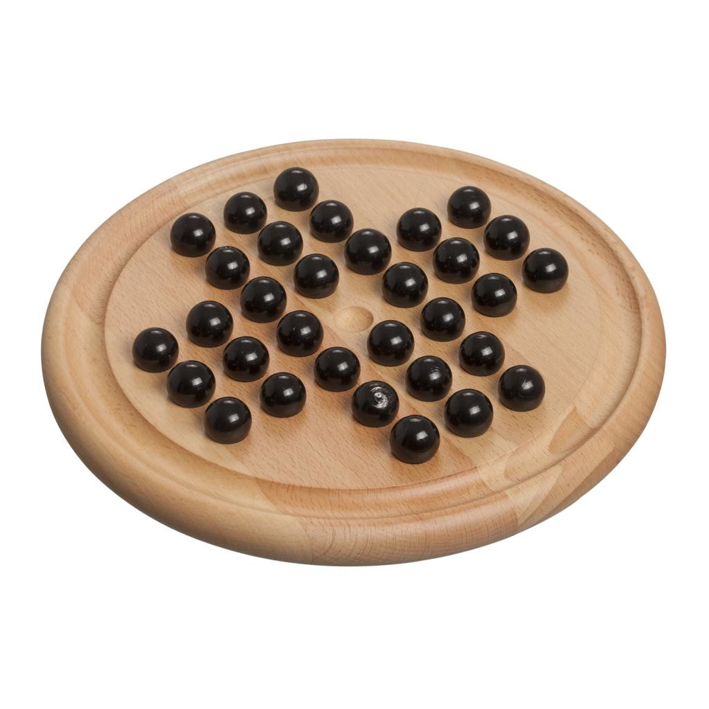 Solitaire is a combination game for one player. It is played with a board containing 33 holes. The game begins with all holes except one containing a playing piece. The aim of the game is to remove all the playing pieces except the last one. A move is affected by one playing piece jumping over an adjacent one into a vacant hole beyond.