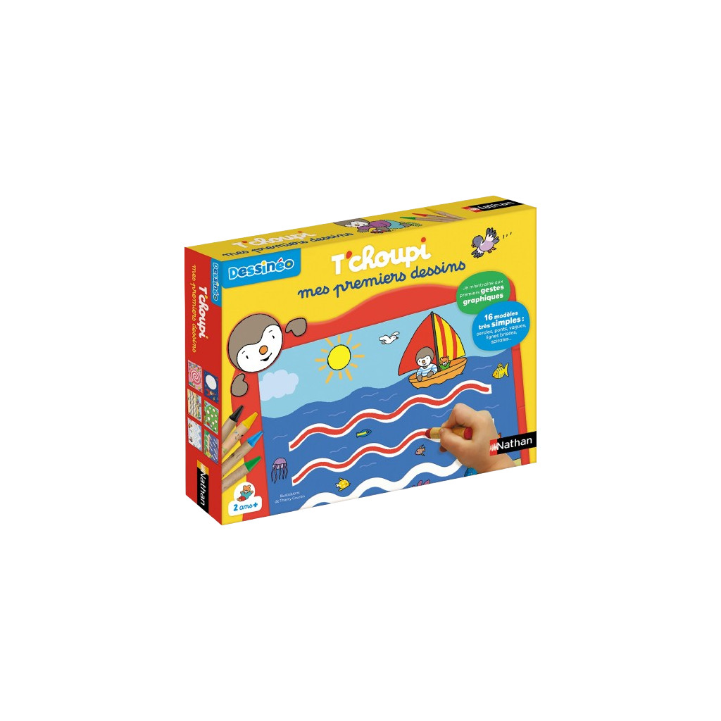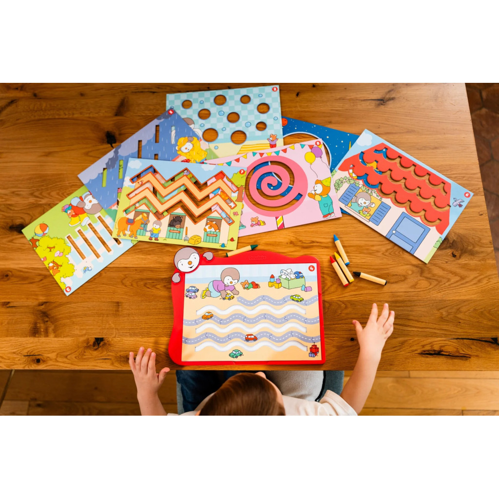 Cardboard stencils illustrated with T'choupi characters guide children's strokes and help them progress from scribbling to their first controlled lines.