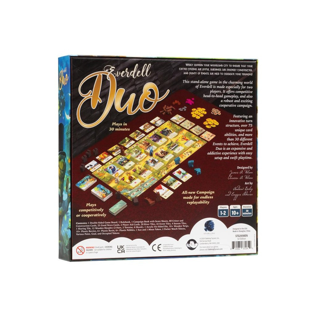 In Everdell Duo, you either compete against your single opponent or play co-operatively with another player to earn the most points. You accomplish this by placing workers to gather resources, then use those resources to play cards face up in front of you, creating your own woodland city.
