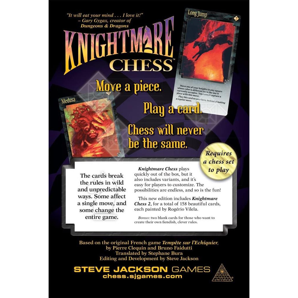 The cards break the rules in wild and unpredictable ways. Some affect a single move, and some change the entire game. Knightmare Chess plays quickly out of the box, but it also includes variants, and it's easy for players to customize. The possibilities are endless, and so is the fun!