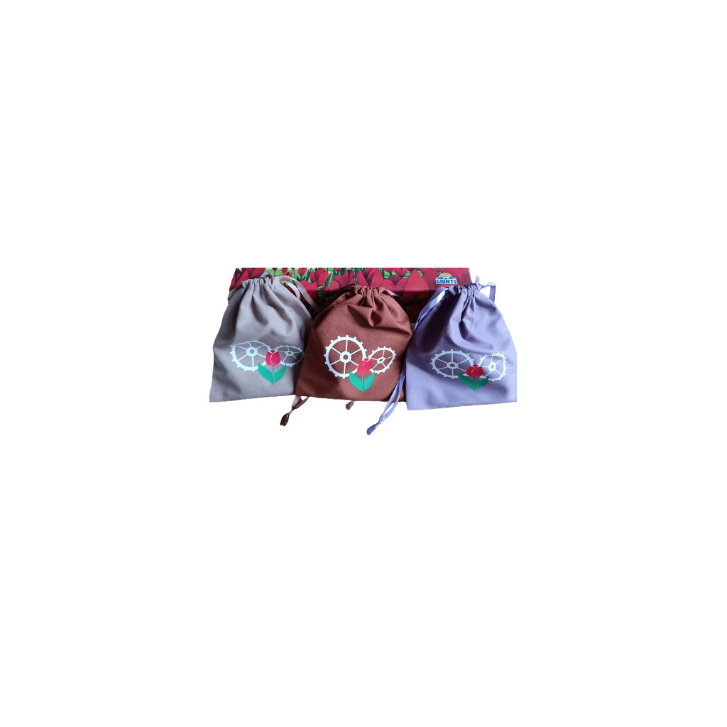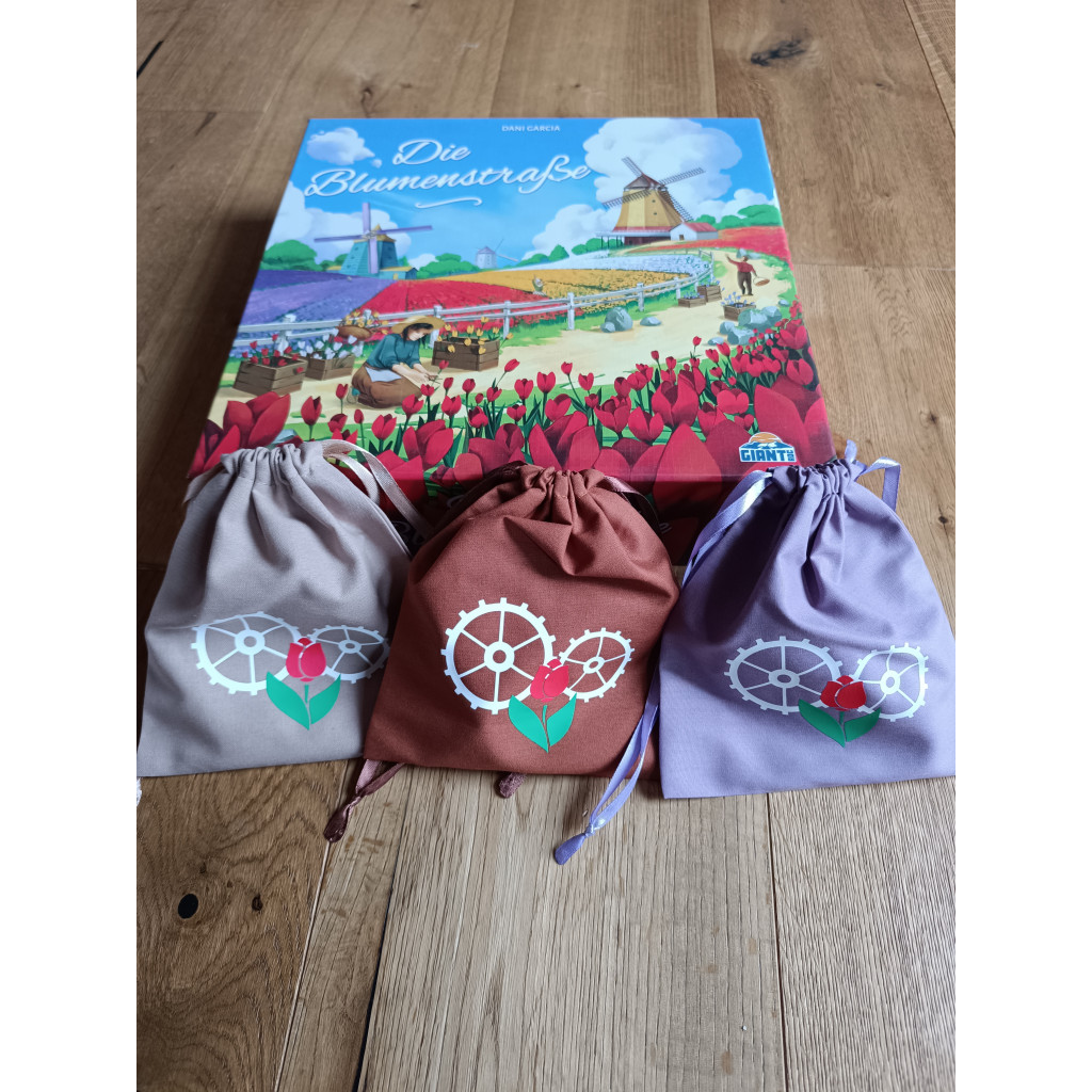 Lot of 3 bags compatible with the game Windmill Valley with assorted logo. The mill wheel improvements can now be stored sorted and easily pulled from one of the bags during the game. No more shuffling and stacking the tiles on the table. Quick game setup, attractive storage, and a great visual presence all in one!