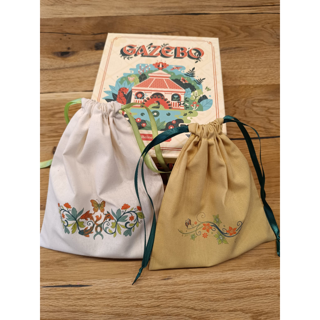 Set of two bags for the game Gazebo in beige and ochre with matching logos. The single- and two-colored tiles can now be easily drawn from the bags during the game. No more shuffling and stacking of tiles required. Quick setup, convenient storage, and a great visual presentation all in one!