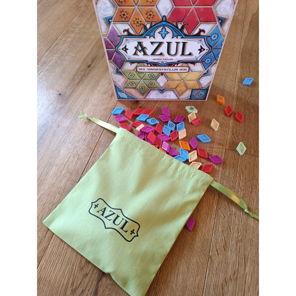 Practical bag for the game Azul : Pavillon d'Été Mini. The large bag (included with the game) can hold all the game components, but it only closes with a snap fastener. Therefore, a smaller bag is now available for the tile pieces, allowing you to store them safely and easily draw tiles during the game. Available in several colors with a matching logo.