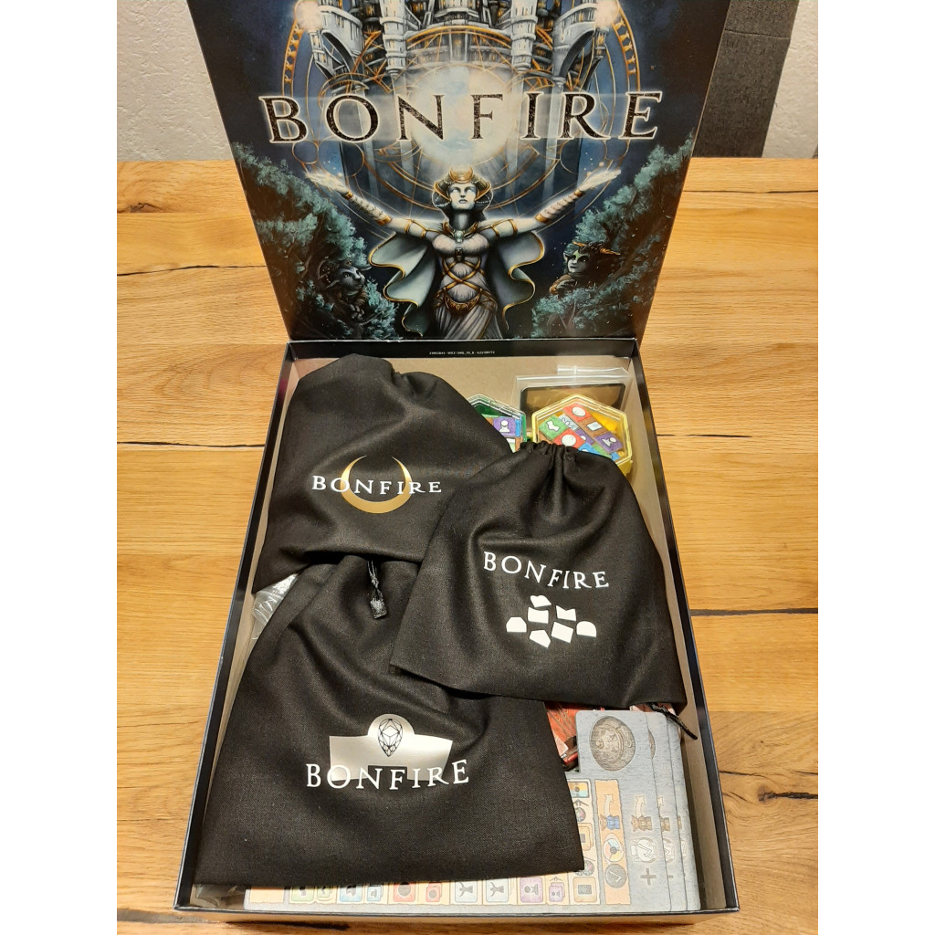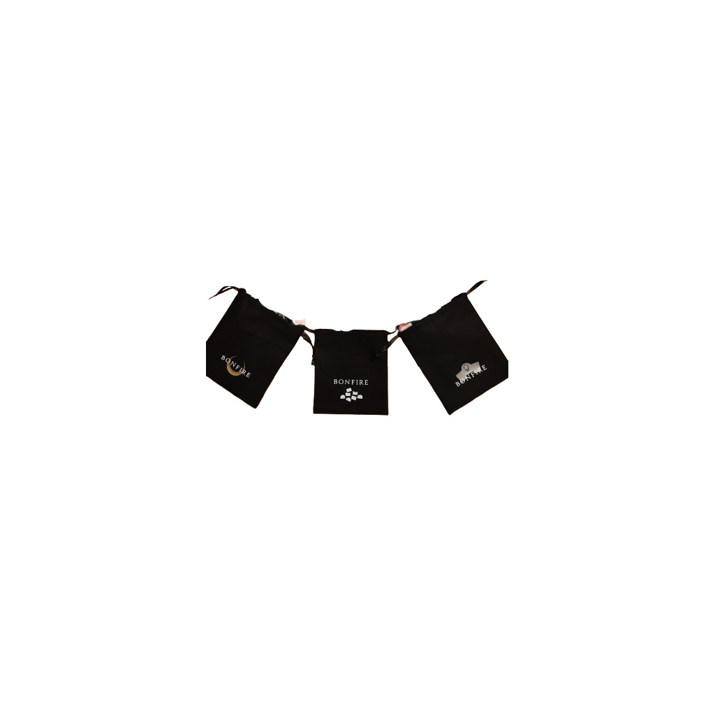 Set of 3 black bags for the game Bonfire, each featuring a matching logo in gold, silver, and white. Tasks, portals, and path tiles can now be easily drawn from the bags during gameplay. No more shuffling and stacking tiles on the table! Quick setup, attractive storage, and a great visual presentation all in one!