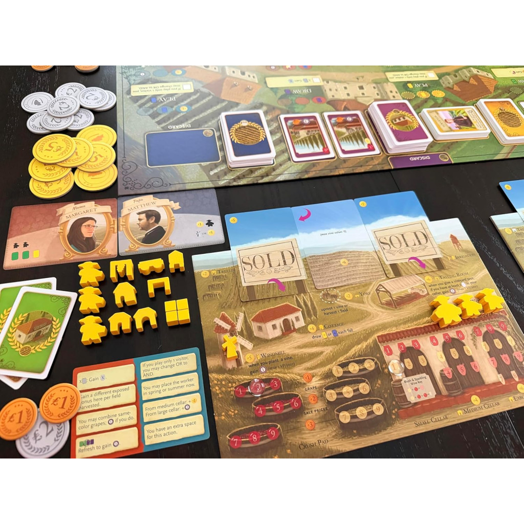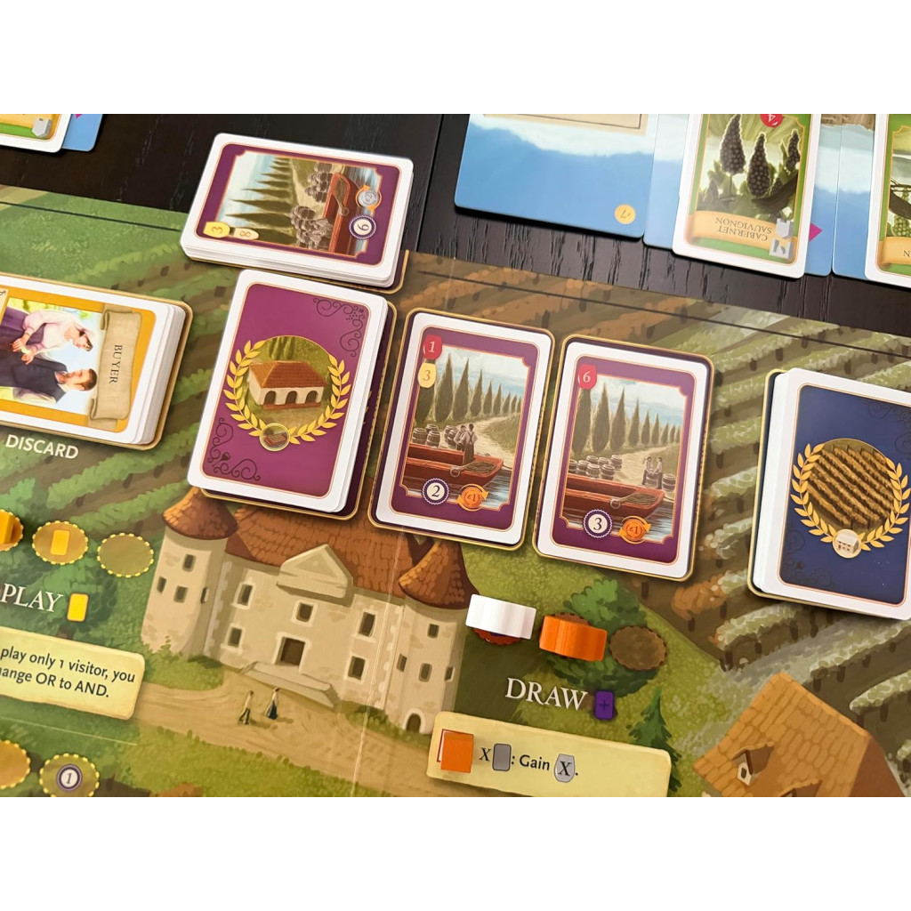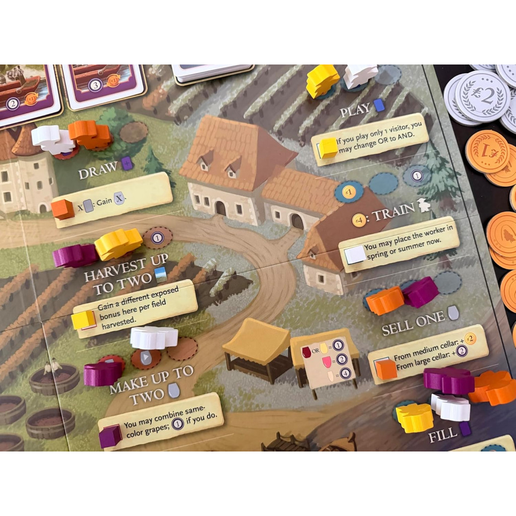 The Bordeaux alternative board expansion to Viticulture offers players a starting boost, 4 full worker placement seasons, a wake-up chart full of benefits, a major new "expert" action that permanently upgrades an action for you, revisions to existing actions, a trade market, face-up cards vine and wine order cards to choose from when drawing, and end-game conversion of grapes, wine, and coins to victory points.