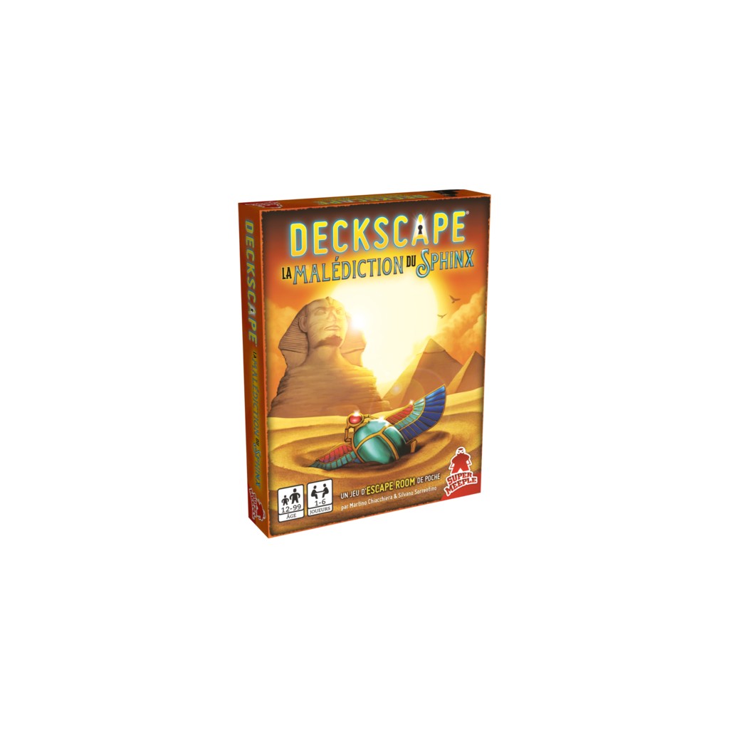 Deckscape - La Malédiction du Sphinx is the sixth title in a series of cooperative games inspired by real escape rooms in which a group of people is "trapped" inside a room full of puzzles and odd items. The goal of the game is to solve puzzles, understand the plot of the story, and make intelligent use of the items provided in order to exit from the room as quickly as possible.