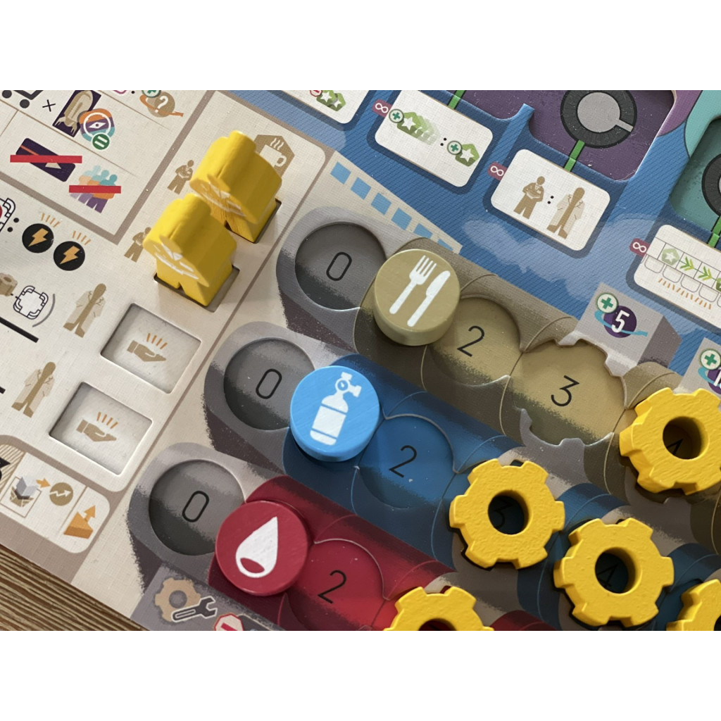 On your turn, you will either place a worker to take two actions in the ever-expanding network, launch a ship and send one of your workers to space as a pilot, or recall all your earthbound workers to collect funding bonuses. Actions include acquiring blueprints, constructing ships, attracting guests, and building developments–connections between locations that increase action selection throughout the game. You will also be affecting resource markets that ebb and flow with the actions of all the players.