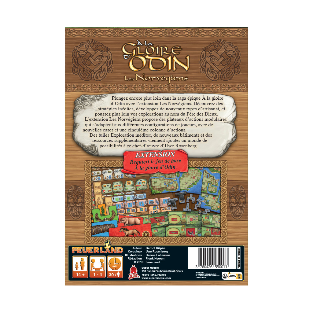 Four new exploration boards, two new types of animals and a three-part action board that can be adapted to suit different numbers of players... the first expansion of "À la Gloire d'Odin" offers you various new elements to renew your games even more!