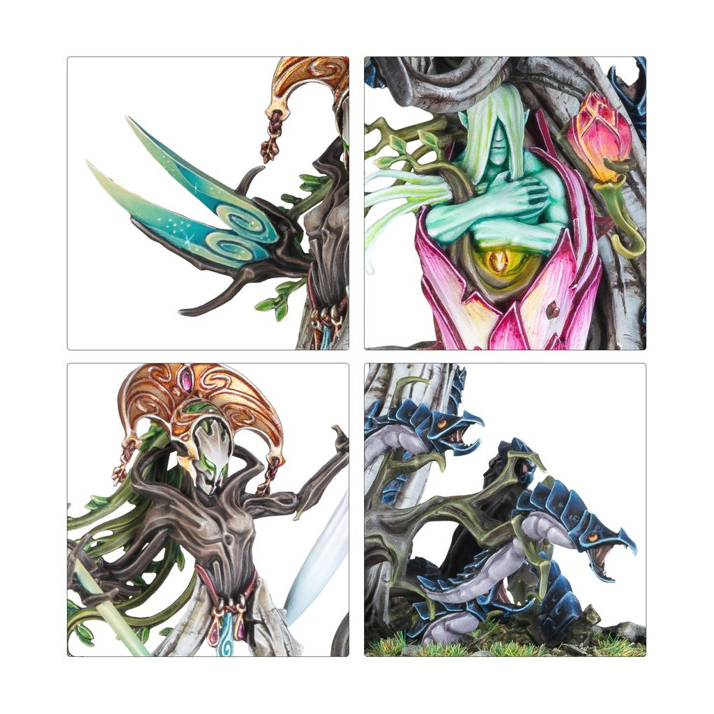 Grove Guardians are the keepers of the sacred soulpod groves – fey wardens whose powers of rejuvenation can grant new life to fallen Sylvaneth. In battle, they slay their foes with deft strikes of their sickles or leaf-bladed shears while regenerating the life energy of harvested lamentiri within the amniotic pods of their genesis trees.
