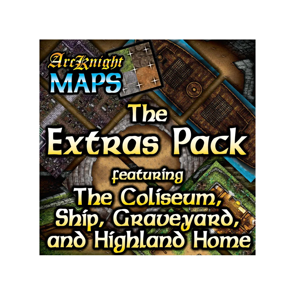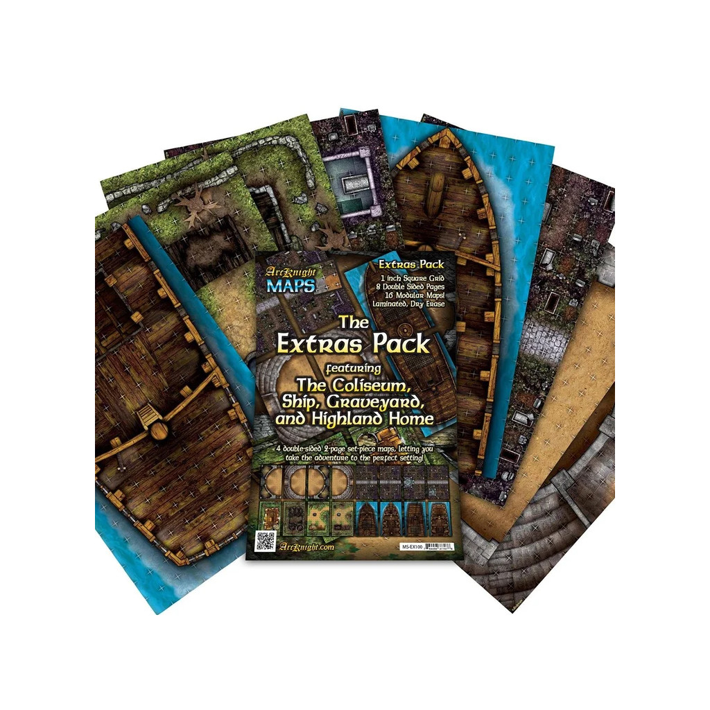 8 Double-sided Pages, 16 modular maps that can be rotated flipped and rearranged. The Extras pack are an assortment of useful 2-page sets, including a Ship, a Colosseum, a Graveyard and a Highland Home.