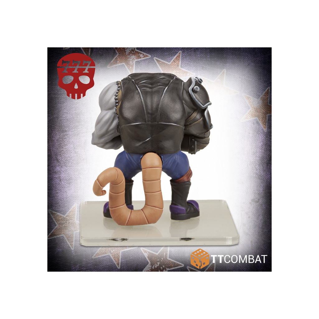 With the strength of three this cybernetically enhanced rodent is going to tear up the ring. The High Speed Chopper is coming in fast with a little 3 Damage hit and the Steel Sleeve Shoulder will smash you across the ring. His signature Grapple, the Rat Splat, will exterminate your health and have you sleeping on the canvas.