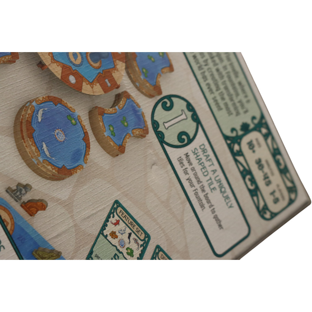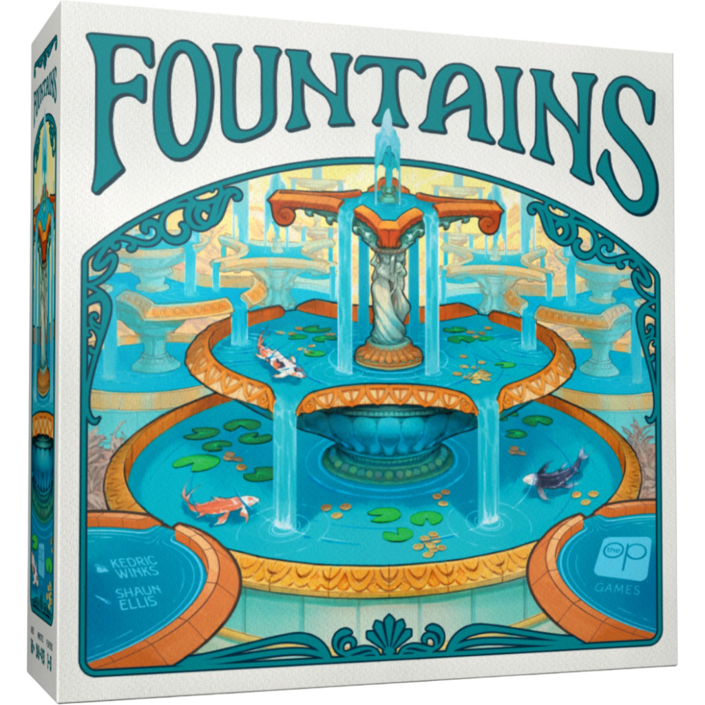 Fountains is a take-and-make game in which each player starts with a round fountain that features a spout and room for four features.