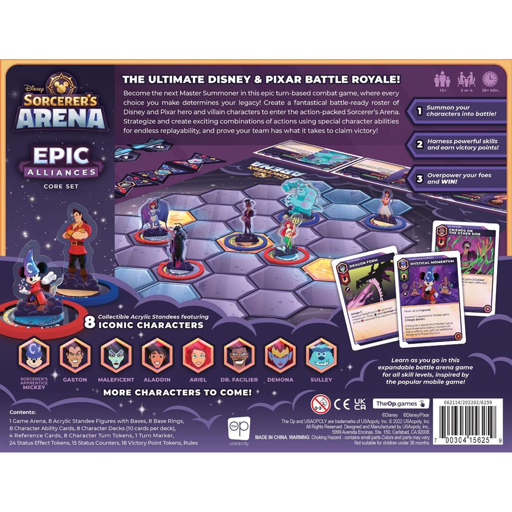 Recruit your characters from a list of Disney and Pixar heroes and villains ready for battle: Mickey the Sorcerer's Apprentice, Gaston, Aladdin, Demona, Sulley, Dr. Facilier, Maleficent and Ariel! Combine your characters' cards into a single deck. Take turns playing standard actions and cards from your hand to move your characters and attack your opponents.