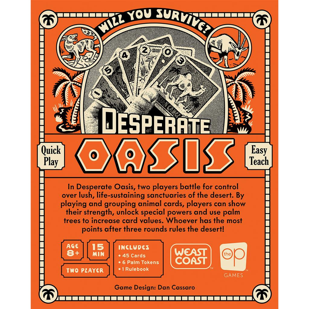 In Desperate Oasis, players deploy and group “animal” cards to demonstrate their power, trigger special abilities, and manipulate the layout of the cards using clever spatial rules. “Palm tree” tokens can increase the value of cards at crucial moments, causing spectacular turnarounds. After three rounds, the player with the most points claims the desert.