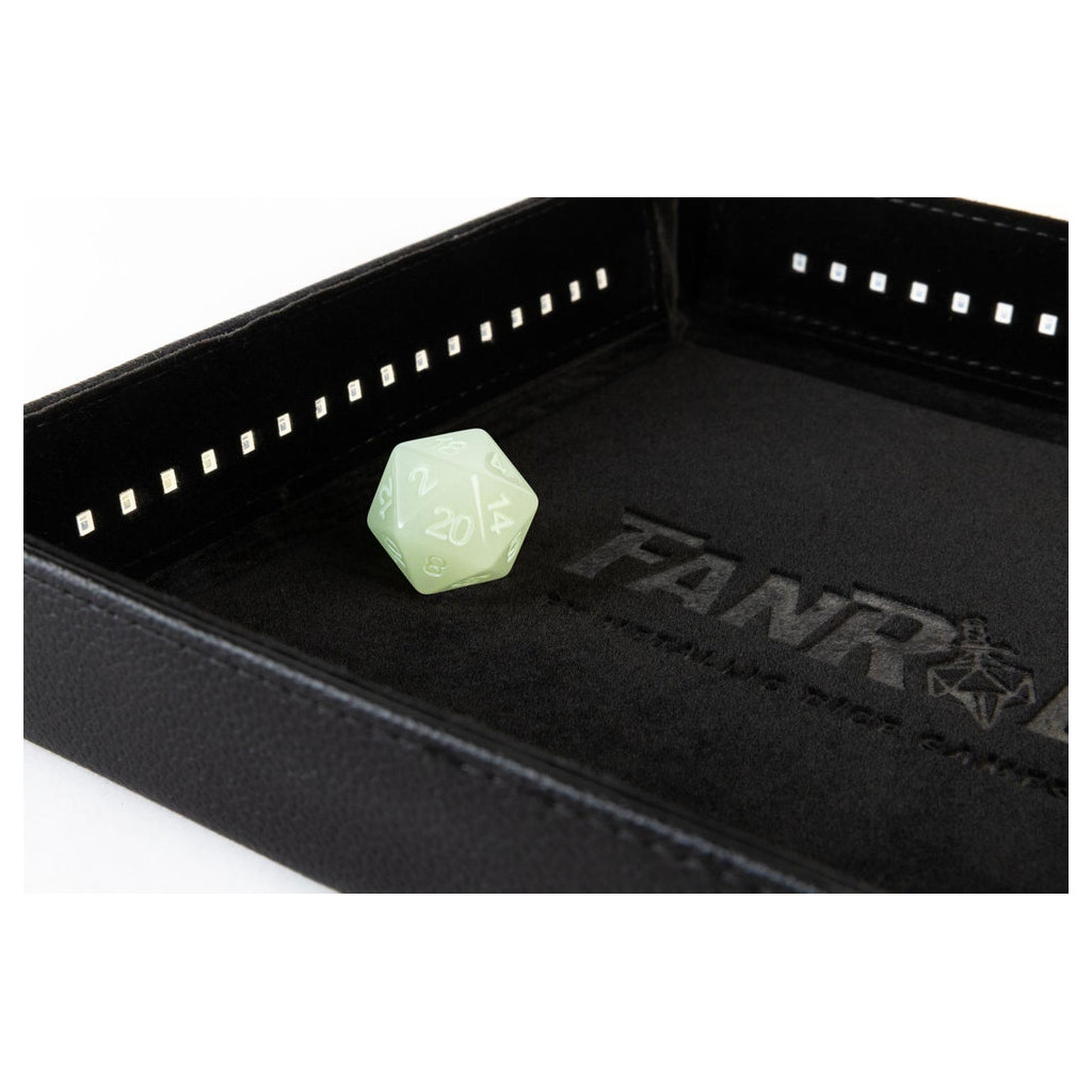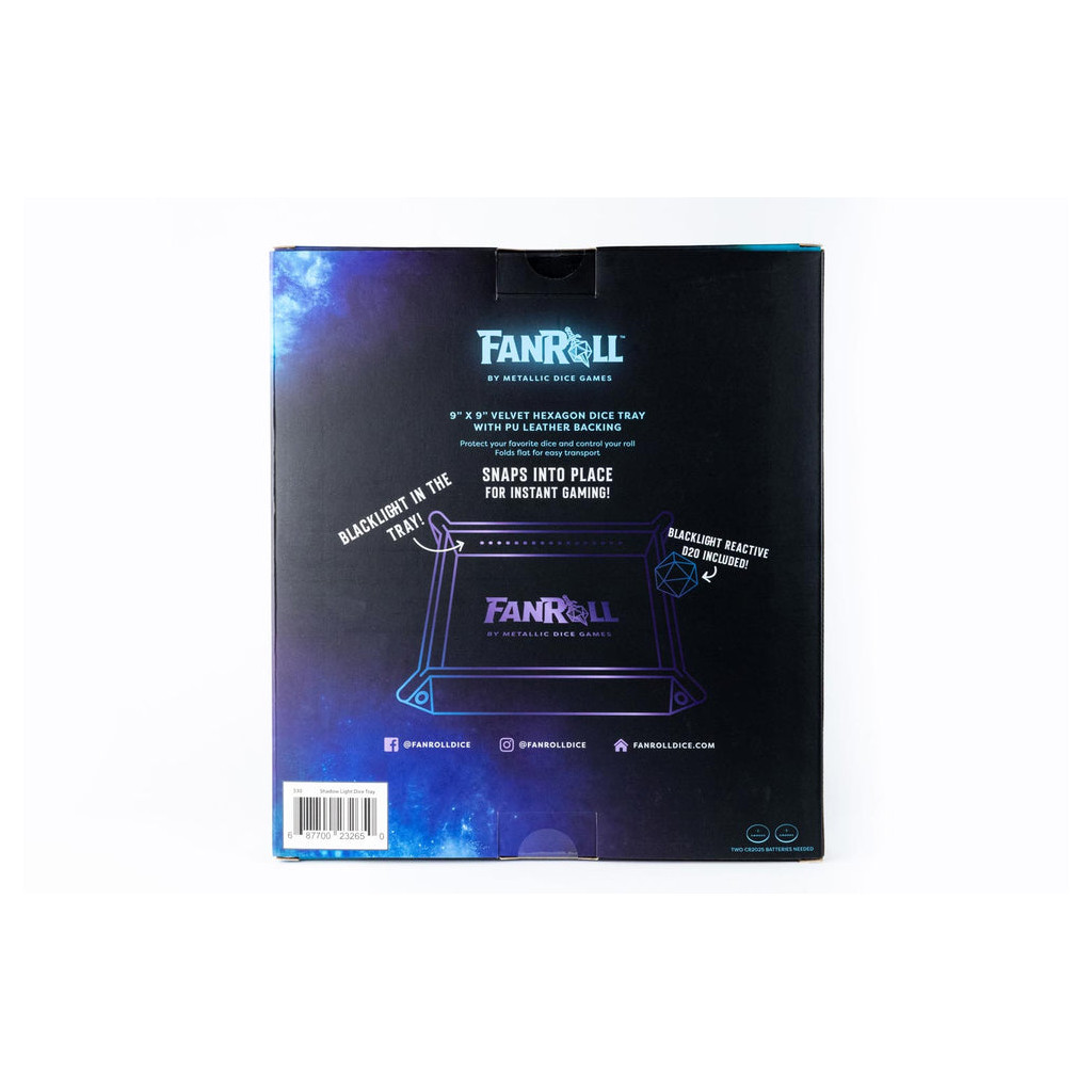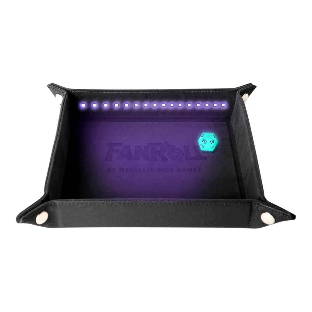 These dice trays have black lights incorporated into the side of the tray to illuminate your tray. Each tray comes with a specialized D20 made to interact with blacklight and bring an incredible glow to your table. Tray's are built with auto-shutoff switches to save the batteries and these pair well with our Shadow Light Elixir Dice.