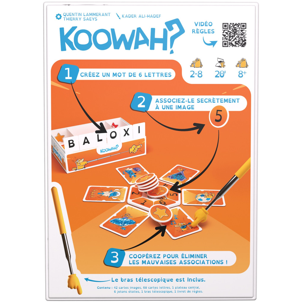 How to play: Once your word has been revealed, the other players enter the game. They must cooperate to eliminate the images that do not correspond to your word, using a telescopic arm to point at the cards. Each correct elimination earns points.