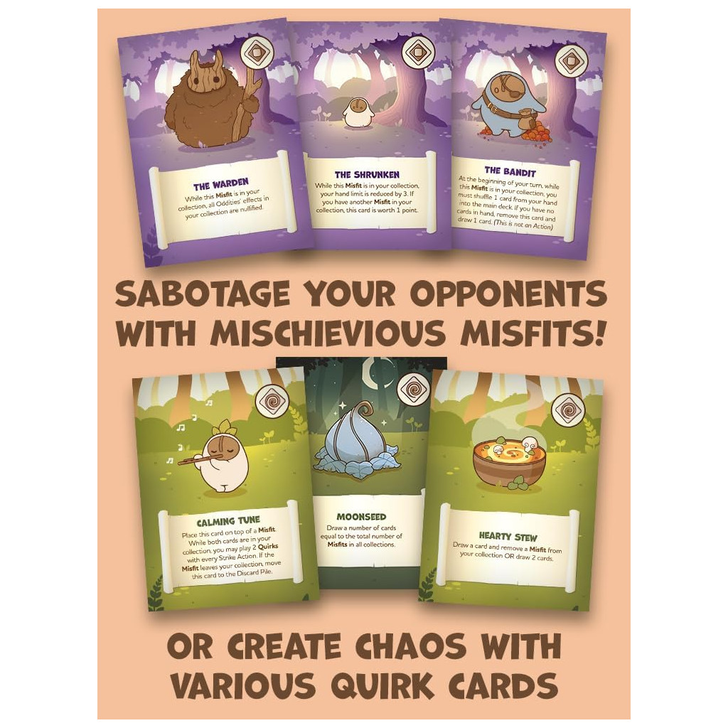But the path there is anything but! Each turn, you’ll choose between collecting points by adding Oddities to your collection, sabotaging your opponents’ plans by gifting them mischievous Misfits, or aiming to turn the tides of victory in a with the effects of powerful Quirks . To top it off, changing seasons may limit what Oddities you can collect each turn, forcing you to adjust your strategy and keep an eye on shifting opportunities.