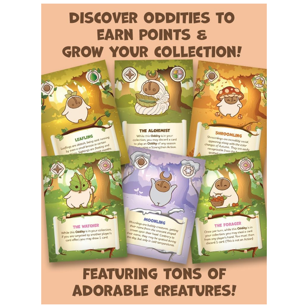 Embark on a whimsical adventure with Oddities, the lightweight card game where players take on the role of daring adventurers, each aiming to create the oddest collection of peculiar woodland creatures!