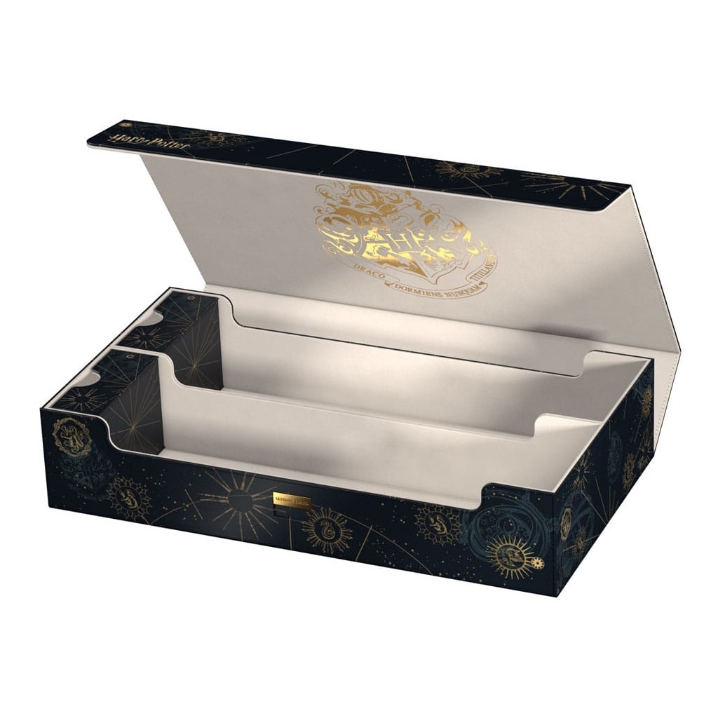 Relive the magic of Hogwarts with the Omnihive 1000+ Xenoskin Harry Potter by Ultimate Guard. This heavy-duty Xenoskin storage box is designed to hold multiple deck boxes, dice, and/or playmats at once, or up to 1000 double-sleeved cards. The Omnihive, along with its two convenient and flexible magnetic compartments inside, features a soft microfiber interior. The lid is secured with strong magnets and our ZnapClaw locking mechanism.