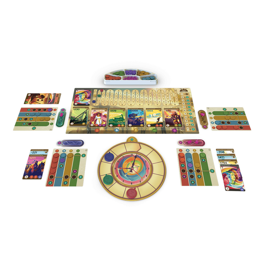 During your journey, you’ll score points in multiple ways, including collecting experience tokens and visiting events in chronological order. You'll do this on a beautiful and colorful neoprene playmat.