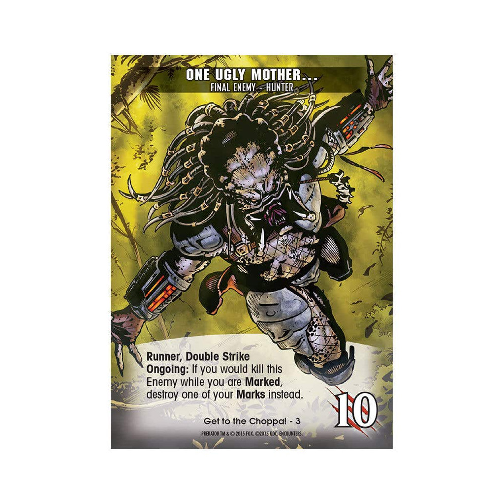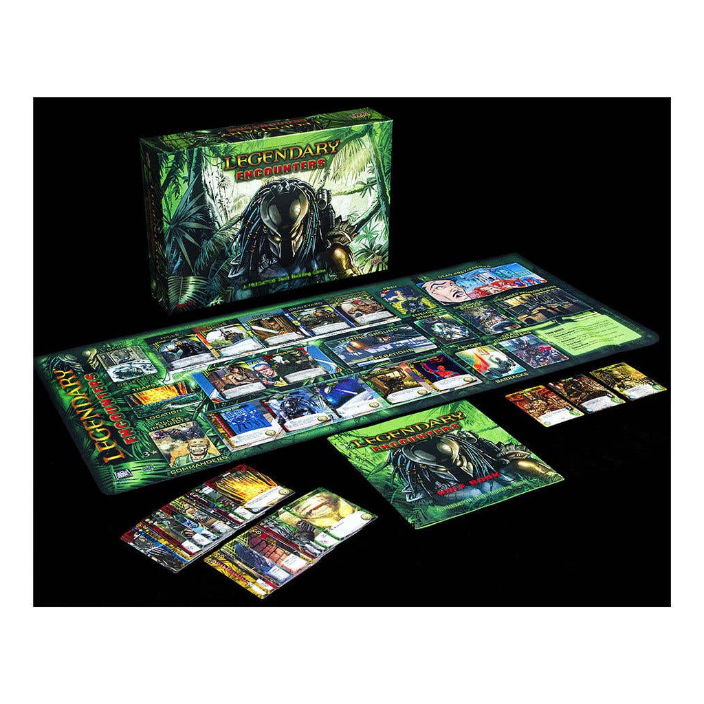 Legendary Encounters: A Predator Deck Building Game is based on the first two movies of the Predator series. Taking on the roles of characters from the films, players take turns recruiting cards for their deck from a central selection in order to improve their deck and defeat Predator cards that are added to the central game board.