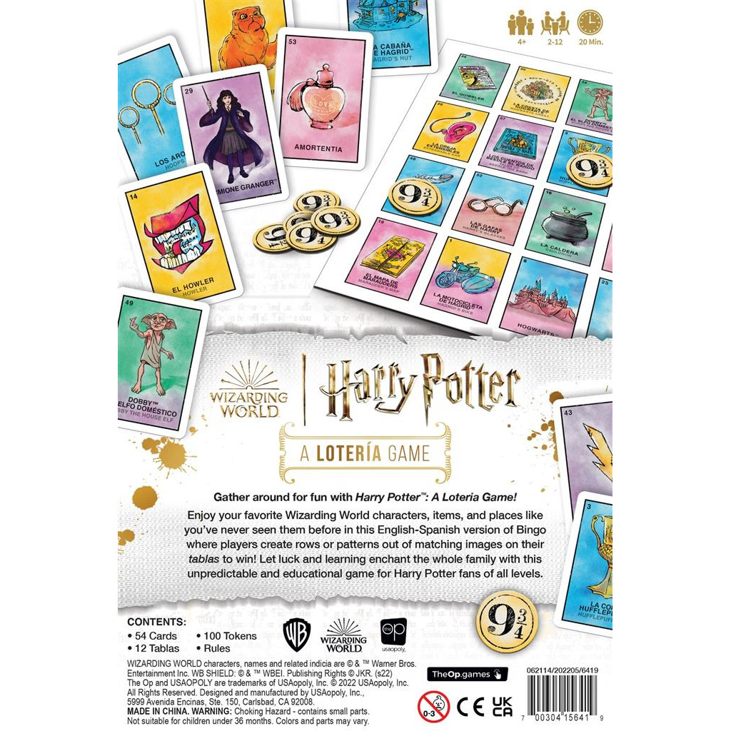 Explore the world of Harry Potter in an all-new way and claim victory with this magical version of Loteria, an English and Spanish version of the popular game of Bingo! Players win by matching images on their tablas with iconic characters, items, and places from the popular franchise, such as Hermione Granger, Rons wand (La Varita de Ron), and Hagrids Hut (La Cabana de Hagrid) illustrated in traditional Loteria style. Alternative rules also allow players to call clues using their wizarding world knowledge! Prepare for luck and learning with this unpredictable and educational game for Harry Potter fans of all levels!