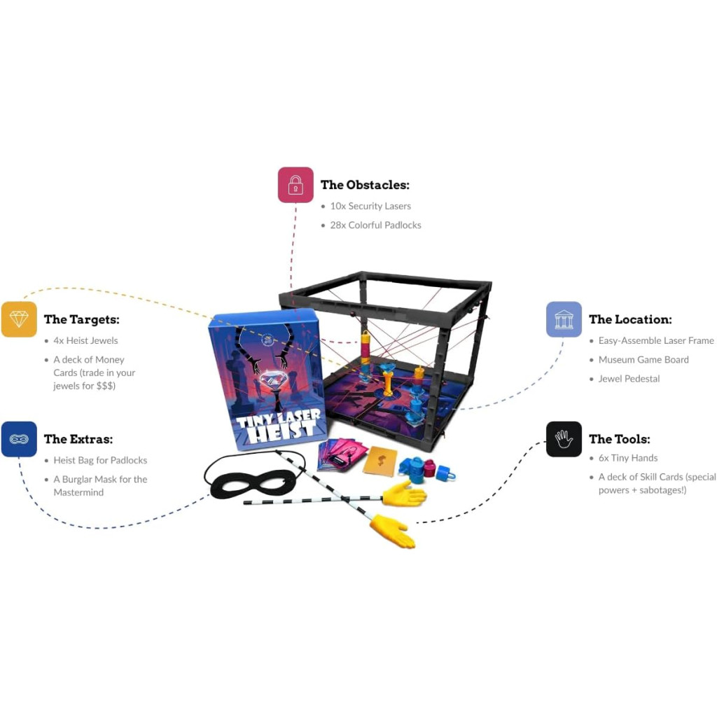 - Dexterity & Planning - Players need two stable hands to maneuver small hands around laser beams and padlocks without triggering them, and planning skills to strategy the steer order and use the cards effectively.