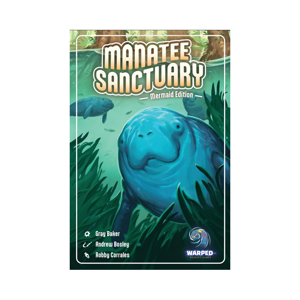 Manatee Sanctuary is a family weight game in which players will draft cards using an "I split you choose" method over the course of 3 rounds. Once the draft is complete players will decide whether to use their cards for their top action, thereby attracting manatees and producing food, or grow their sanctuary by tucking the top portion of the card under their ever expanding board creating more room for manatees and increasing their food production. There are many different types of manatees in the sea each with their own effects and after each player has finished using their cards everyone must feed all their hungry manatees!
